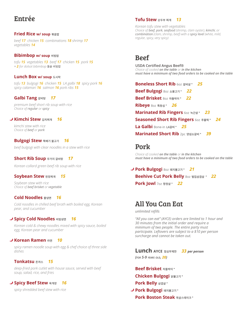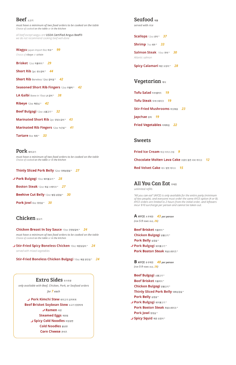 Beef brisket, ribeye, marinated beef short rib, marinated rib fingers, beehive cut pork belly, beef bulgogi, garlic butter jumbo shrimp, beef short rib. / 차돌박이, 특등심, 양념소갈비, 늑간살, 벌집삼겹살, 소불고기, 마늘버터새우, 갈비.