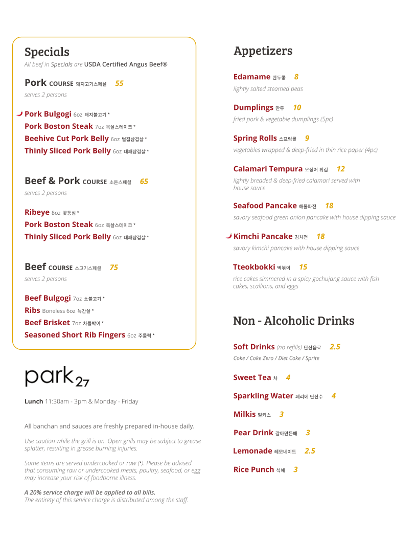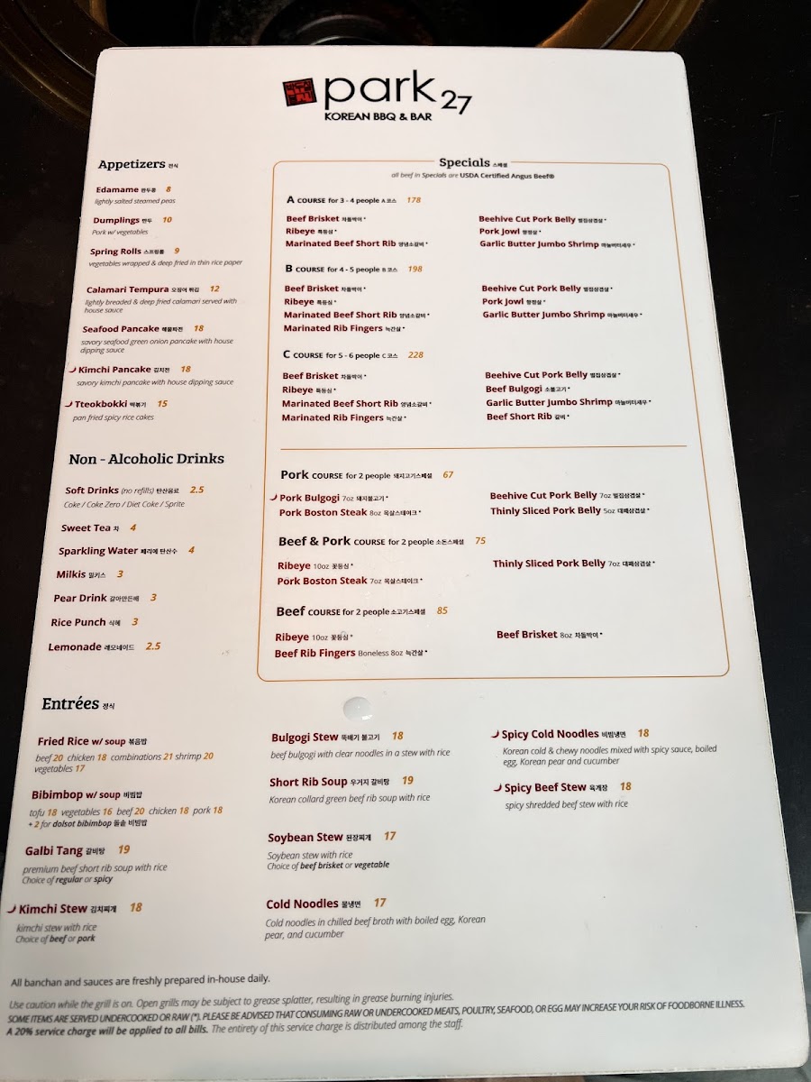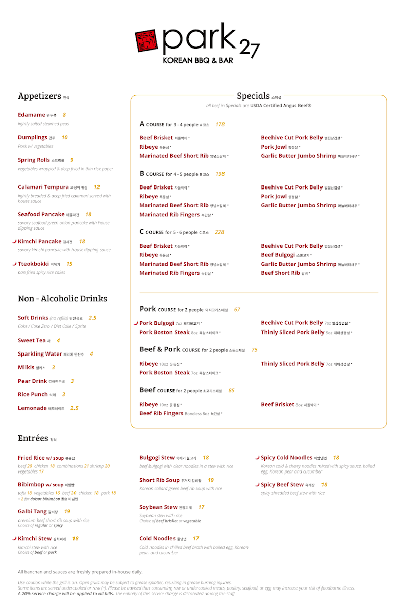 Park27 Korean BBQ and Bar - Centennial Park Menu